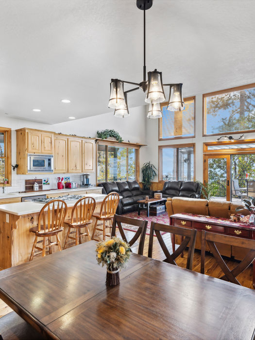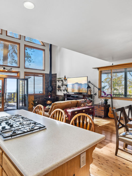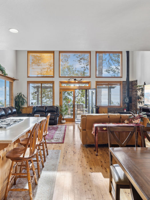 Upon entry, you'll be awed by the soaring 28-foot ceilings. The open-concept design features real wood pine floors, connecting the living, dining, and kitchen areas for 270-degree views. Enjoy sunrises and sunsets from the comfort of your home, with a wood-burning fireplace for chilly nights. The main level also includes a bedroom and laundry room.